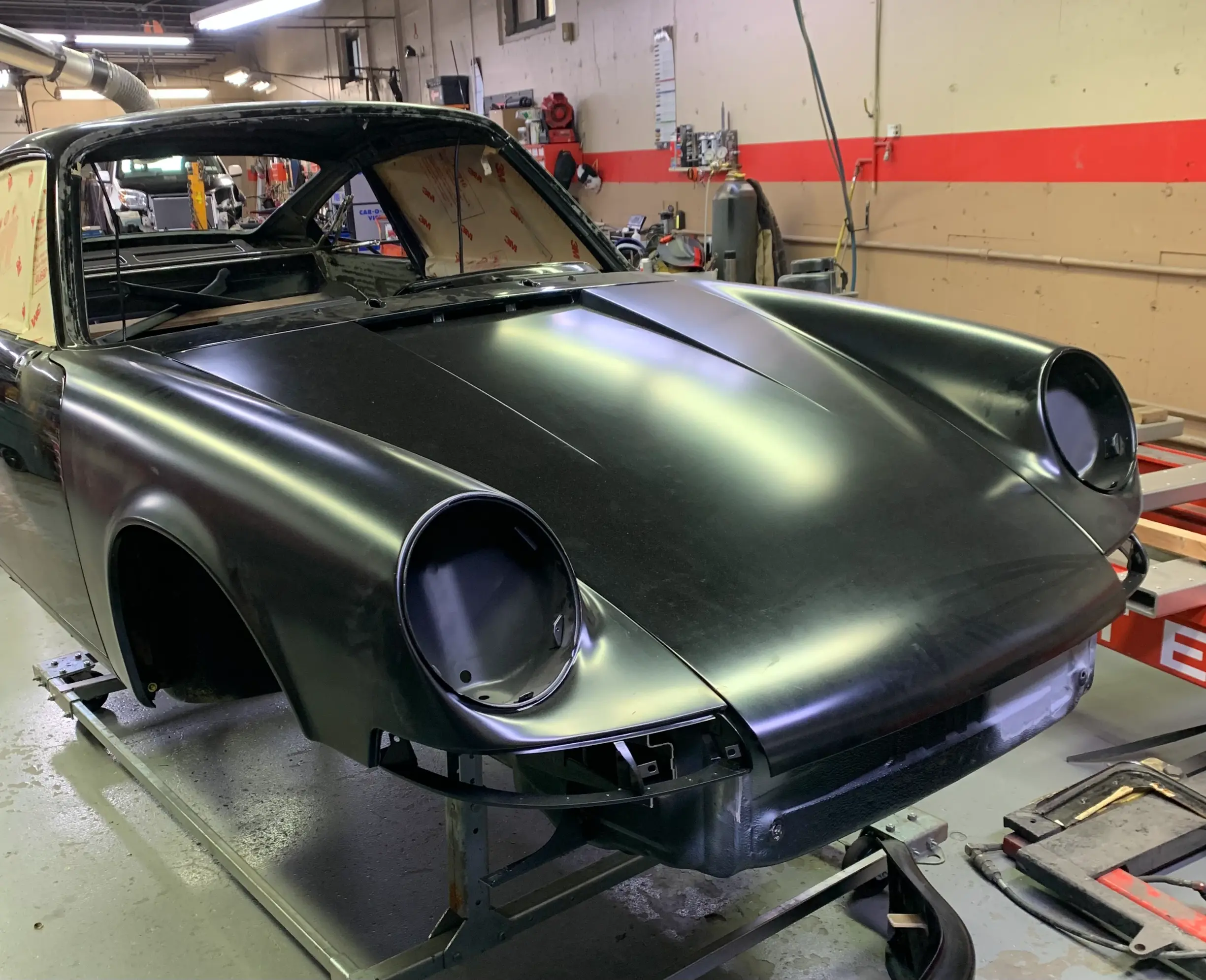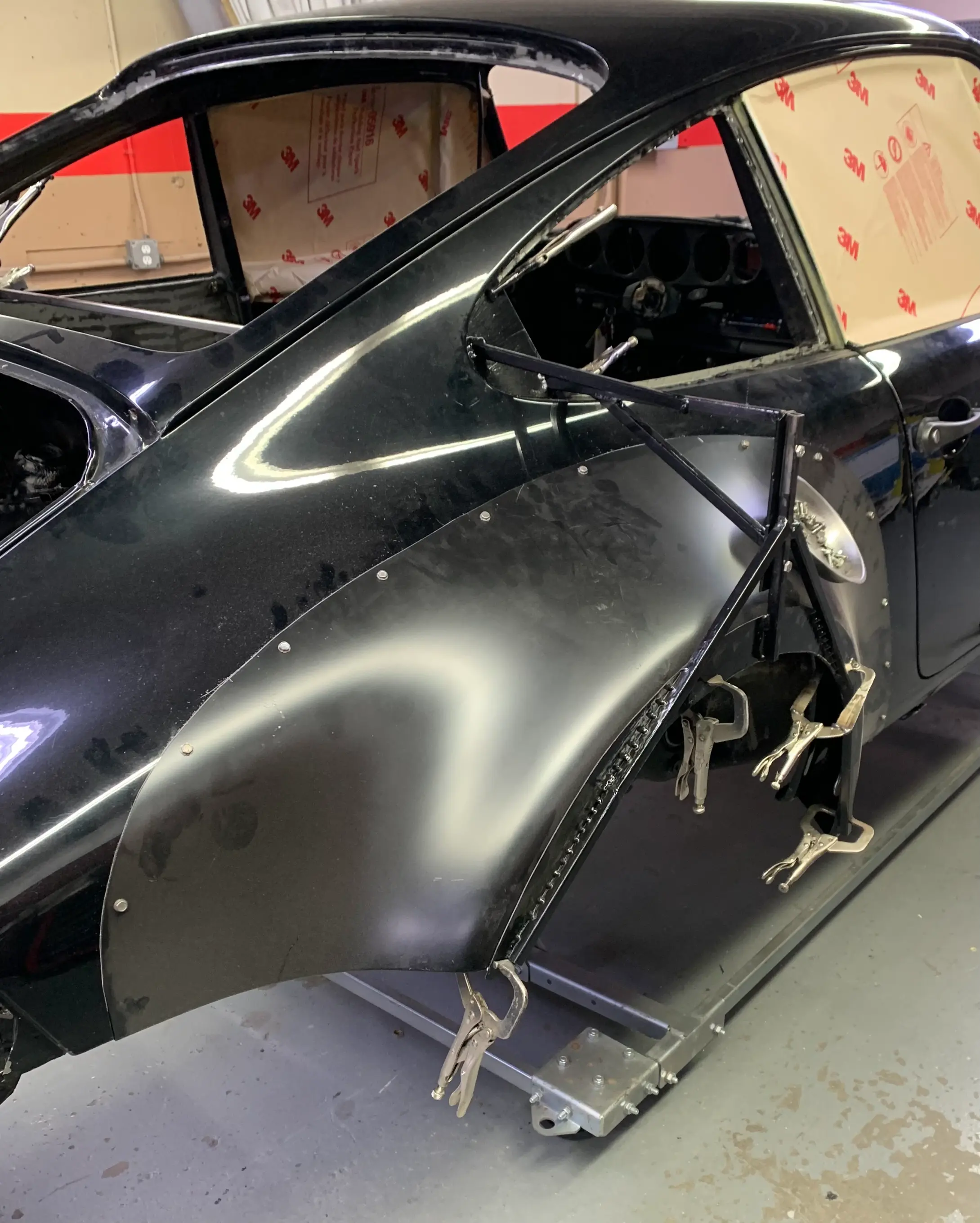 Every build begins with a donor 3.2 Carrera. Steel flares are welded on, original-style fiberglass panels are added, and the shell is fully painted to match the new RSR profile.